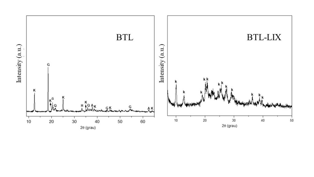 The chemical composition of BTL consisted of SiO2 (29.2 % wt %), Al2O3 (43.6 wt %), Fe2O3 (22.3 wt %) and TiO2 (3.17 %). The Si/Al molar ratio was 1.12. Based on the composition of cancrinite formed by Si and Al and Si/Al ratio of 1:1 (Reyes, Williams and Alarcón, 2013), the BTL sample was used as raw material for its synthesis. Fig 2 shows the XRD patterns of BTL and BTL-X. The main constituents of the BTL sample were monoclinic kaolinite-1 Md (PDF 00-003-0052), gibbsite (PDF 00-074-1775), hematite (PDF 01-084-0307), quartz (PDF 01-080-2147), and anatase ((PDF 01-078-2486), while only triclinic kaolinite 1A (PDF 01-074-1786) and quartz were present in BTL-LIX. These results indicated that the acid leaching process favored a change in the crystalline system of kaolinite (from monoclinic to triclinic), in addition to possibly removing Fe, Al, and Si oxides previously present in BTL.