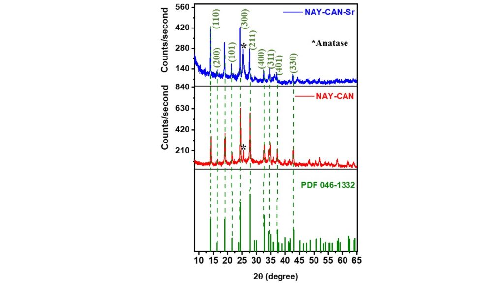 XRD patterns of the synthesized Na-cancrinite (NaY-CAN) and its strontium form (NaY-CAN-Sr) are showed in Fig. 3. The characteristic XRD peaks of cancrinite appeared clearly for both samples, although they decreased in intensity in the Nay-CAN-Sr sample, suggesting that the cation exchange in the cancrinite framework may have caused a structural disorder. Moreover, it was possible to measure the average crystallite size (ACS) by Scherrer equation and degree crystallinity (DC) of the Na-cancrinite (NAY-CAN) and Sr-cancrinite (NAY-Can-Sr) structures according to the Eq. 1 and Eq. 2, respectively. The results indicated that Na-cancrinite showed an average crystallite size of 27.5 nm and crystallinity of around 54 %, while Sr-cancrinite showed a crystallinity of 50 % and crystallite size of 124 nm, thus suggesting that the insertion of Sr2+ into the structure has not affected the degree of crystallinity but influenced the increase in crystal grain size.