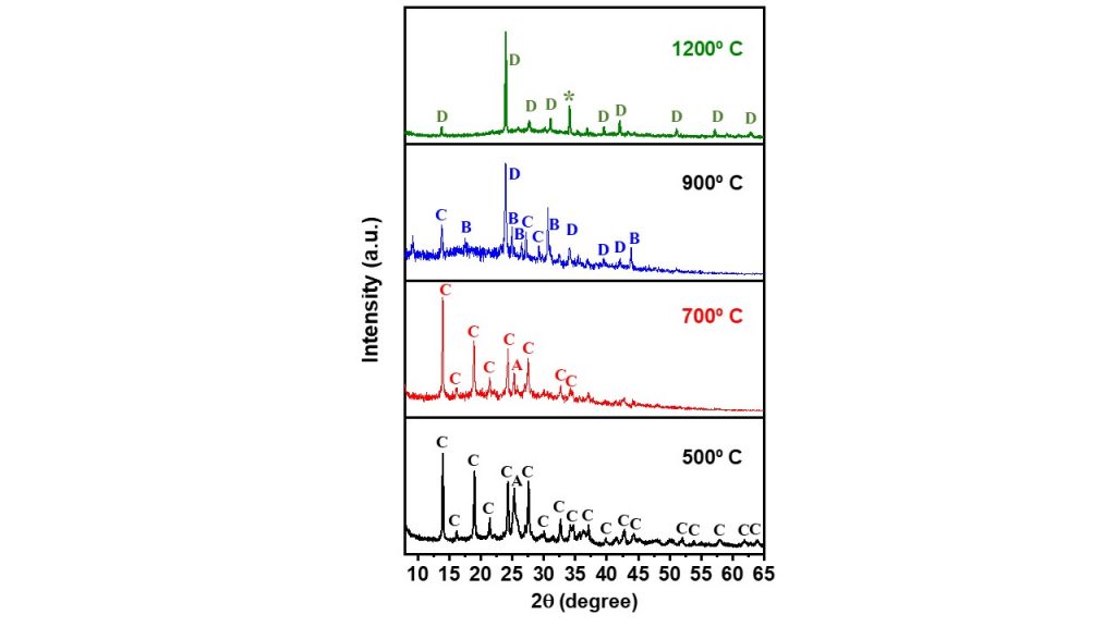 The XRD patterns of the NAY-CAN-Sr heated at different temperatures are shown in Fig. 5. In the temperature range of 500-700º C, the Sr-cancrinite phase remained stable, as identified by the XRD patterns, which also indicated a reduction in crystallite size from 27 nm to 20 nm, respectively. With increasing temperature, a reduction in crystallinity from 33 % to 20 % was also observed. Up to 900º C, trace phases like Sr-cancinite and SrSiO3 (PDF 036-0018) were observed, as well as a predominant phase of SrAl2Si2O8 (PDF 038-1454). A further increase in temperature (~1200º C) was accompanied by the complete formation of SrAl2Si2O8, and showed the occurrence of the Sr-cancrinite-SrAl2Si2O8 phase conversion at high temperature and a relatively short time (~ 60 min).