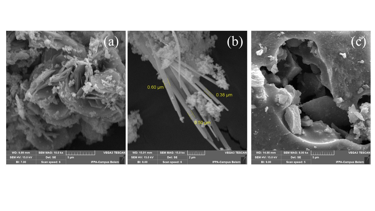 SEM images of the raw material after acid leaching (BTL-LIX), Na-cancrinite (NAY-CAN) and SrAl2Si2O8 (NAY-CAN-1200º C) are displayed in Fig. 6. Regarding to BTL-LIX (Fig. 6a), an agglomeration of plate particles around 5 mm length confirmed the XRD kaolinite 1A polytype, which is present in triclinic crystal system (Ece and Ercan, 2024). On the other hand, the SEM images in Figure 6b revealed that sodium cancrinite is in the form of stacks consisting of well-defined needle crystallites with an average thickness of 500 nanometers (0.50 mm) immersed in a base of undefined agglomerates, probably related to the amorphous phase as previously described in the X-ray diffractometry results. A porous structure morphology could be observed for the strontium aluminosilicate sample obtained above 1000º C (Fig. 6c).
