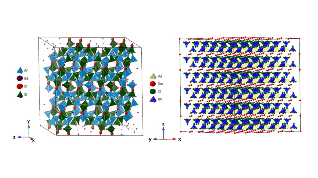 Celsian, ideally BaAl2Si2O8, is a rare barium aluminosilicate that occurs in metamorphic environments and was first reported by Igelström (1867) from manganese mines of Jakobsberg (Sweden) as “red feldspar, occurring in veins a few lines wide in a dense, light-colored, which itself is barite-containing” (Sjogren, 1895). It stands out in the felspar group due to its polymorphic diversity (Fig. 1), which is basically made up of TO4 tetrahedron units (T = Al, Si) connected by corners in a [Al2Si2O8] framework, large size of Ba2+ as out net cations and monoclinic symmetry with I2/m space group (Hoghooghi et. al., 1994; Skellern et al., 2002; Marocco et al., 2011; Radosavljevic-Mihajlovic et al., 2012; Radosavljevic-Mihajlovic et al., 2017). Another naturally occurring polymorph reported is monoclinic paracelsian with P21/a space group (Chiari et al., 1985). There are also two other polymorphic structures of BaAl2Si2O8, consisting of double layers of [Al2Si2O8] and Ba2+ ions interlayers with orthorhombic and hexagonal symmetries, known as a and b-hexacelsian, respectively (Dondur et al., 2005; Lopes-Badillon et al., 2013). It is important to emphasize that other cations can replace Al3+ and Si4+ (i.e., Ge4+ and Ga3+) in the TO4 units of the framework, as well as out net cations (i.e., Li+, Na+, K+, Co2+, Pb2+, Ca2+ and Sr2+), which makes it possible to obtain new structures of technological interest (Wang et al., 2016; Gorelova et al., 2024).