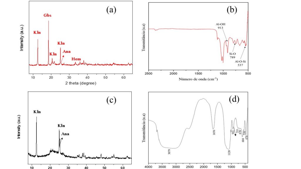 The chemical and mineral composition of BWC (Tab. 1 and Fig. 2a) showed that the starting material consisted of high levels of Al2O3 (43.6% m/m), SiO2 (29.2% m/m), Fe2O3 (22.3% m/m) and TiO2 (3.17% m/m). And is composed of gibbsite (PDF 00-012-0460), hematite (PDF 00-013-0534), anatase (PDF 01-078-2486), quartz (PDF 01-082-0512) and kaolinite (PDF 00-006-0221) were identified. A complementary FTIR spectroscopic characterization of the starting material was also carried out (Fig. 2b) and showed characteristic bands of Si-O stretching at 1101 and 789 cm-1 well correlated to the quartz mineral. The bands at 1033 and 913 cm-1 corresponded to the Si-O and Al-OH stretching in kaolinite structure, while the band at 537 cm-1 could be ascribed to the Fe-O vibrations of hematite (Fe2O3). Fig. 2c shows the XRD pattern of BWC-LIX, which indicates the absence of the hematite and gibbsite phases. Only kaolinite and anatase were identified in the sample, as also observed by the presence of FTIR bands of Al-O-H stretching at 3660 cm-1, Al-O-H at 914 cm-1, Si-O-Si at 670 cm-1 (Fig. 2d). The bands at 604 and 470 cm-1 were well correlated with the Ti-O vibrations of anatase (Iriarte et al., 2005; Saikia and Parthasarathy, 2010; Chougala et. al., 2017; Ahmad et al., 2021).