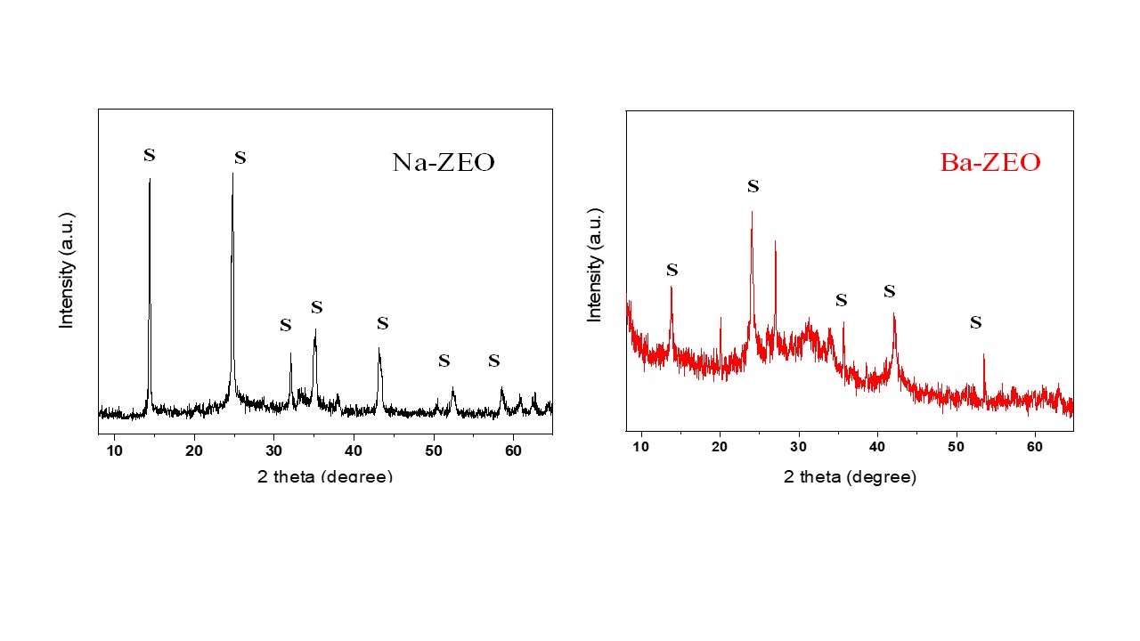 The XRD patterns of Na-ZEO and Ba-ZEO are shown in Fig. 3. For the Na-ZEO sample, the XRD pattern was characterized by well-defined peaks at 13.81°, 24.04°, 34.27°, 42.31°, 51.41° (2 theta), which corresponded to the (110), (211), (222), (330) and (431) planes of cubic sodalite (PDF 01-082-1812). The average crystallite size calculated using the Scherrer equation was 58 Å. On the other hand, the XRD pattern of Ba-zeo indicated disordering in the sodalite framework after ion exchange treatment with Ba2+ ions, as observed by the low intensity and definition of the peaks. In addition, amorphous material may be present in the Ba-ZEO sample.