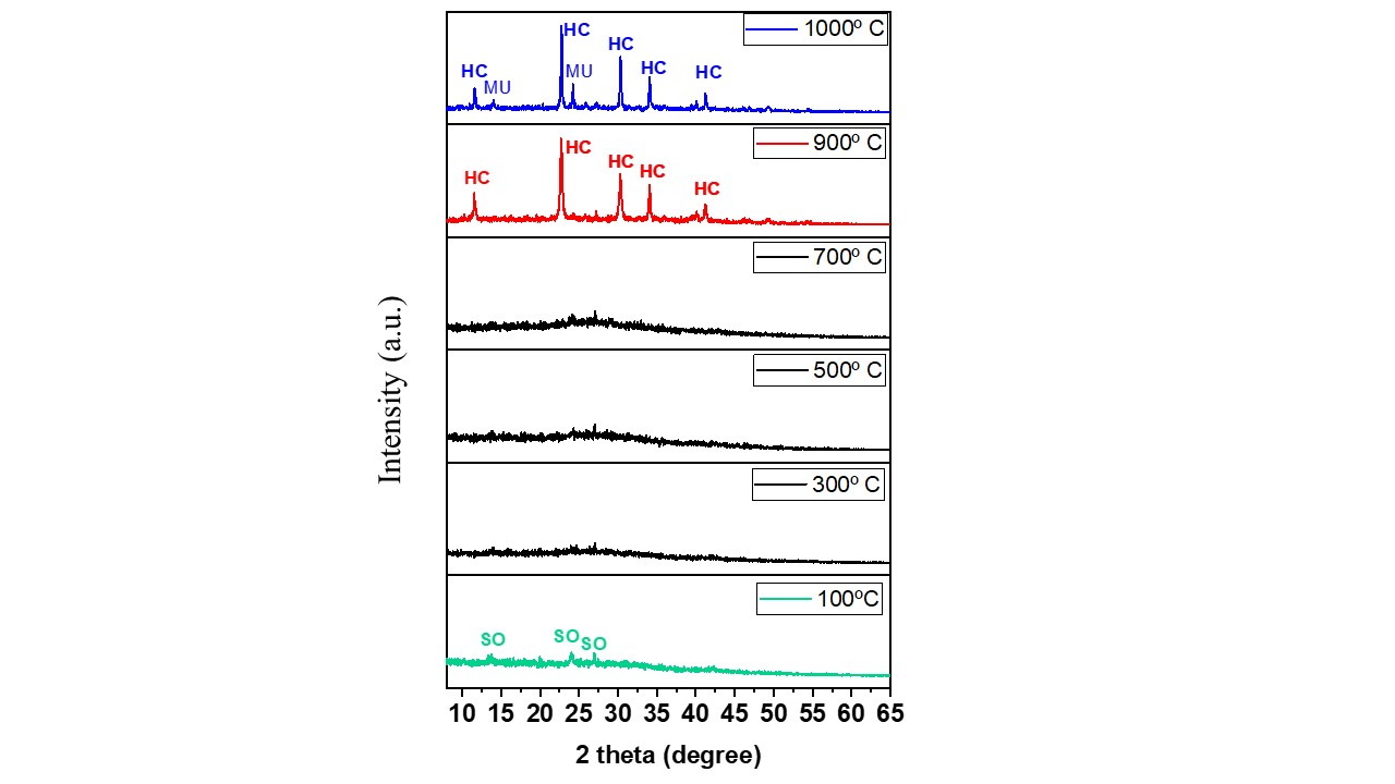 The thermal transformations of Ba-sodalite into celsian were monitored by XRD analysis and shown in Fig. 4. The results revealed that even at a relatively low temperature (100º C), the barium-doped sodalite structure showed a broadening of its main peaks with low intensity, suggesting an intense decrease in the ordering of the zeolitic structure. As the temperature increased, this disorder became more pronounced, and the structure probably transformed into a quasi-amorphous phase between 300-700º C. Up to 900º C, the XRD pattern revealed the presence of peaks at 11.48, 22.66, 30.26, 33.96 and 41.16º (2 theta), which were well correlated with the (001), (101), (012), (110) and (11-2) reflections of the hexacelsian phase (PDF 01-088- 1050). For the sample heat-treated at 1000º C, in addition to the hexagonal celsian phase, mullite (01-088-1050) was also identified. It is worth noting that these results for the thermal behaviour of Ba-sodalite are like those described for zeolite A and 13 X doped with Ba, which were synthesized to obtain celsian (Radosavljevic´-Mihajlovic et al., 2015; López-Badillo et al., 2013; Wang et al., 2016).