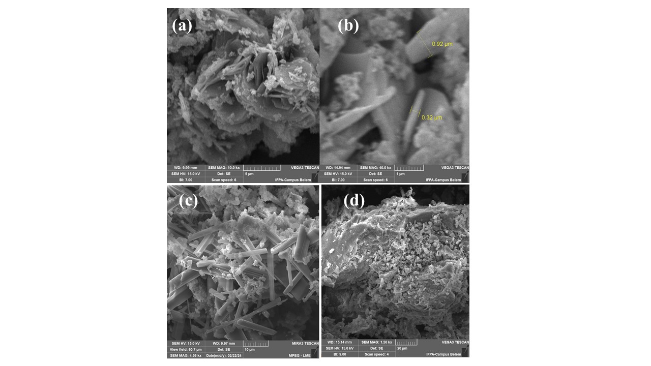 A morphological characterization of the starting material leached by H2SO4 (BWC-LIX), zeolitic precursor (Na-ZEO) and its product heated at 900 ºC (Ba-ZEO-900) were carried out by using scanning electron microscopy (Fig. 5). A pseudo-hexagonal plate morphology could be identified with an average size of 1 mm and thickness of 0.32 mm (Fig. 5a, b). This morphology is common in clay minerals and showed that kaolinite has preserved its plate morphology, despite of acid treatment over 12 h. For sodium sodalite sample (Fig. 5c), aggregates of sticks-shaped morphology with an average size of 15 mm and 1 mm thickness were observed. It is worth noting that this morphology differs from that in wool ball reported for sodalite obtained from kaolin tailings (Paz et al., 2010; Sousa et al., 2020), suggesting that pre-treatment by alkaline fusion may interfere the morphology of the final product. After the sintering process at 900 ºC, it was possible to observe a complete transformation of the sticks into aggregates with an undefined shape of hexagonal celsian (Fig. 5d).