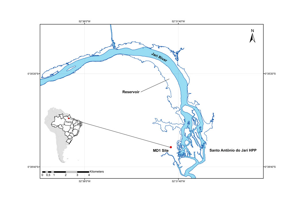 Figure 1. Location of the Santo Antônio do Jari hydroelectric power plant and MD1 site, where the pendant has been found. (Source: Scientia Consultoria).