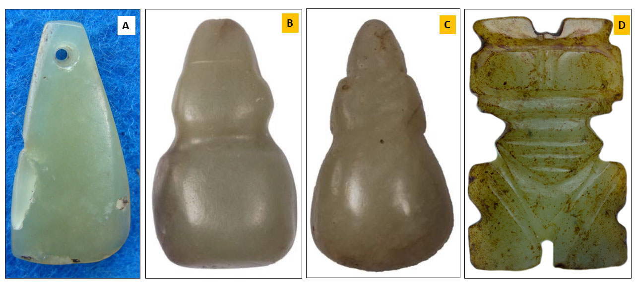 Figure 11 – A) The contextualized tremolite pendant MD 1 SA3 of this study, 2.521 cm length; B) and C) two non-contextualized Amazon muiraquitãs carved in tremolite-actinolite, 5.5 cm and 3.0 cm length, respectively (Meirelles et al., 2012); D) the contextualized tremolite Maranhão´s muiraquitã, 2.92 cm in length (Navarro et al., 2017).