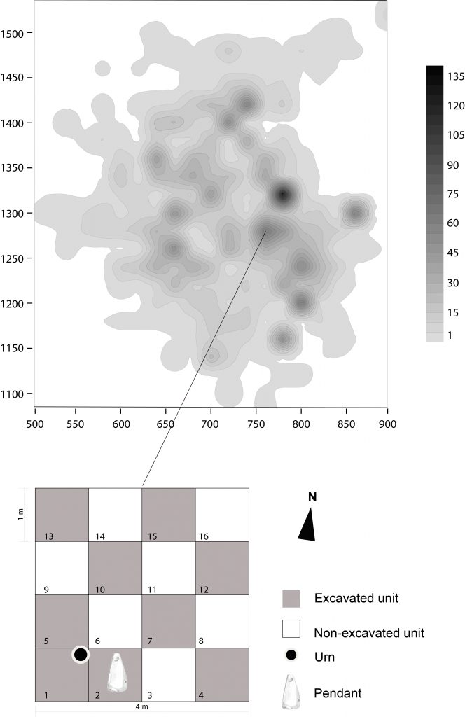 Extensive excavations carried out in the site uncovered two areas associated with funerary context, presenting urns with human remains inside and outside the vessels, also, associated with this context were ceramic and lithic artifacts (Figure 2).