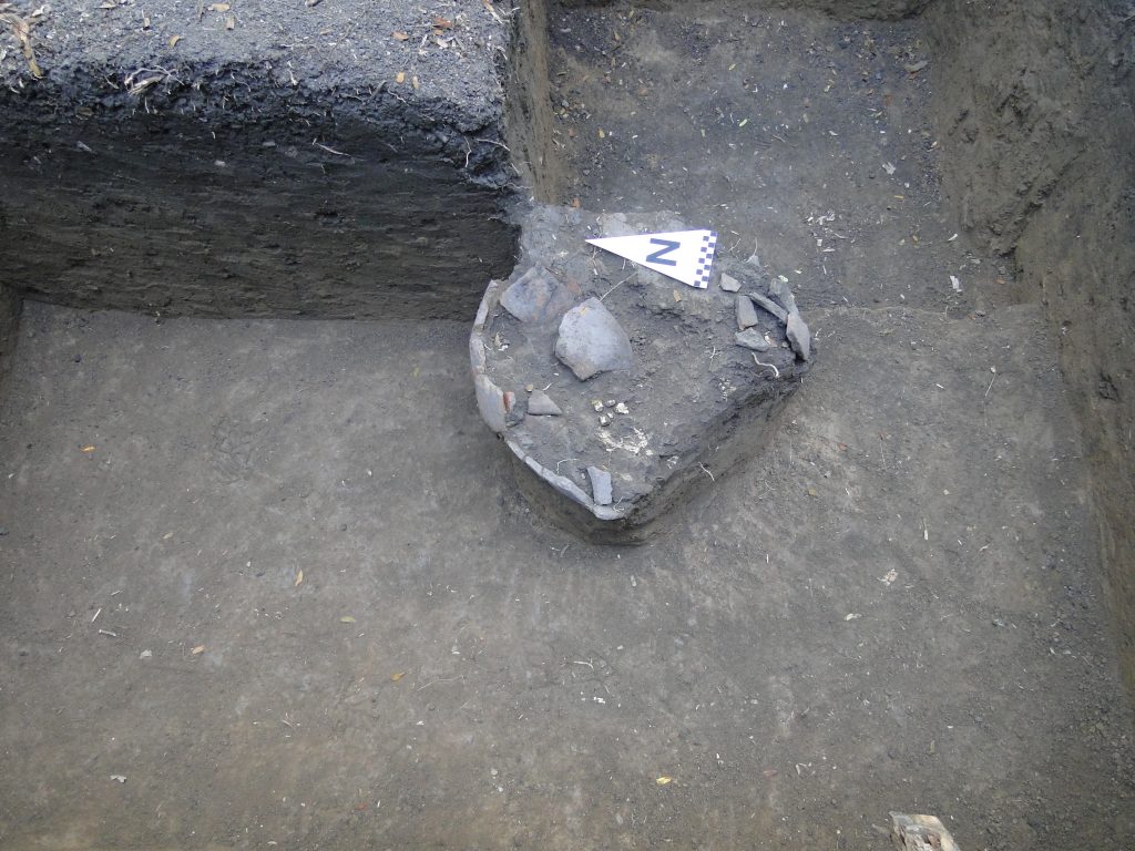 Figure 3 – The place where the pendant has been found beside a funerary urn (white arrow) in the dark earth soil, anthropogenic strata visible on the profile showing the A horizon upward. (Source: Scientia Consultoria).
