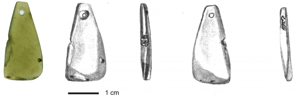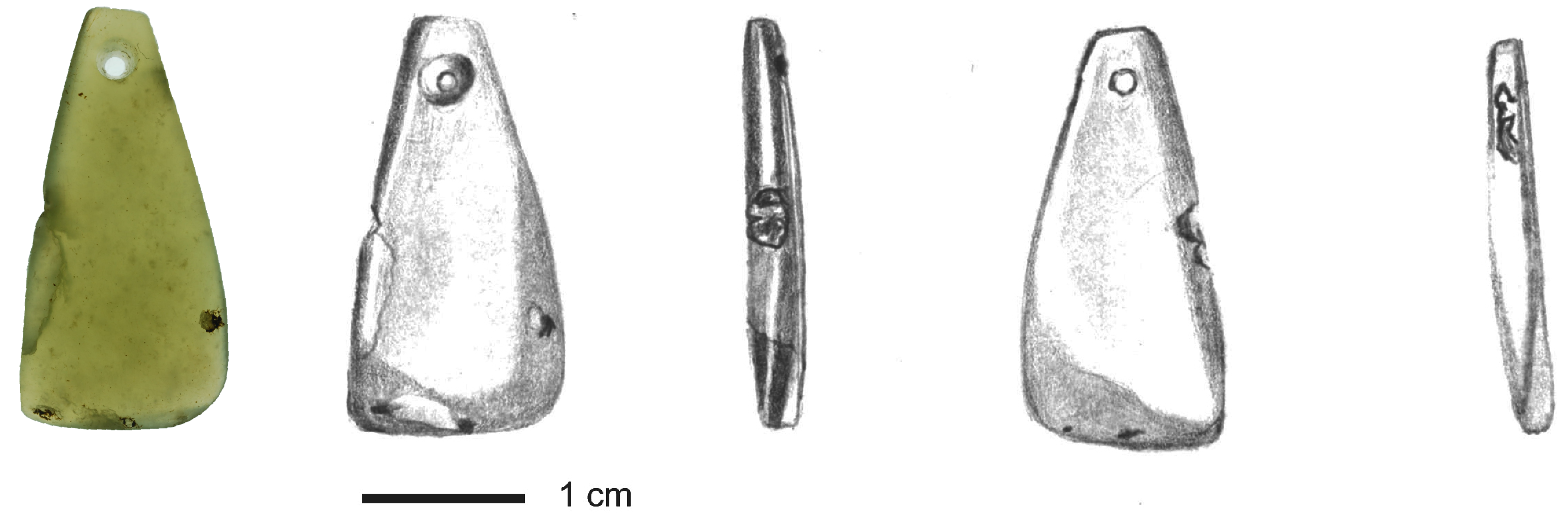 In area SA3 of the MD 1 site, a single lithic artifact made on “green stone” was recovered during excavation in spatial association with a funerary urn (Figure 2). The artifact is a small triangular pendant (25.21 mm tall, 12.46 mm wide, and 2.97 thick as maximal measurements), presenting a small perforation in one of the vertices, and completely polished (Figure 3).