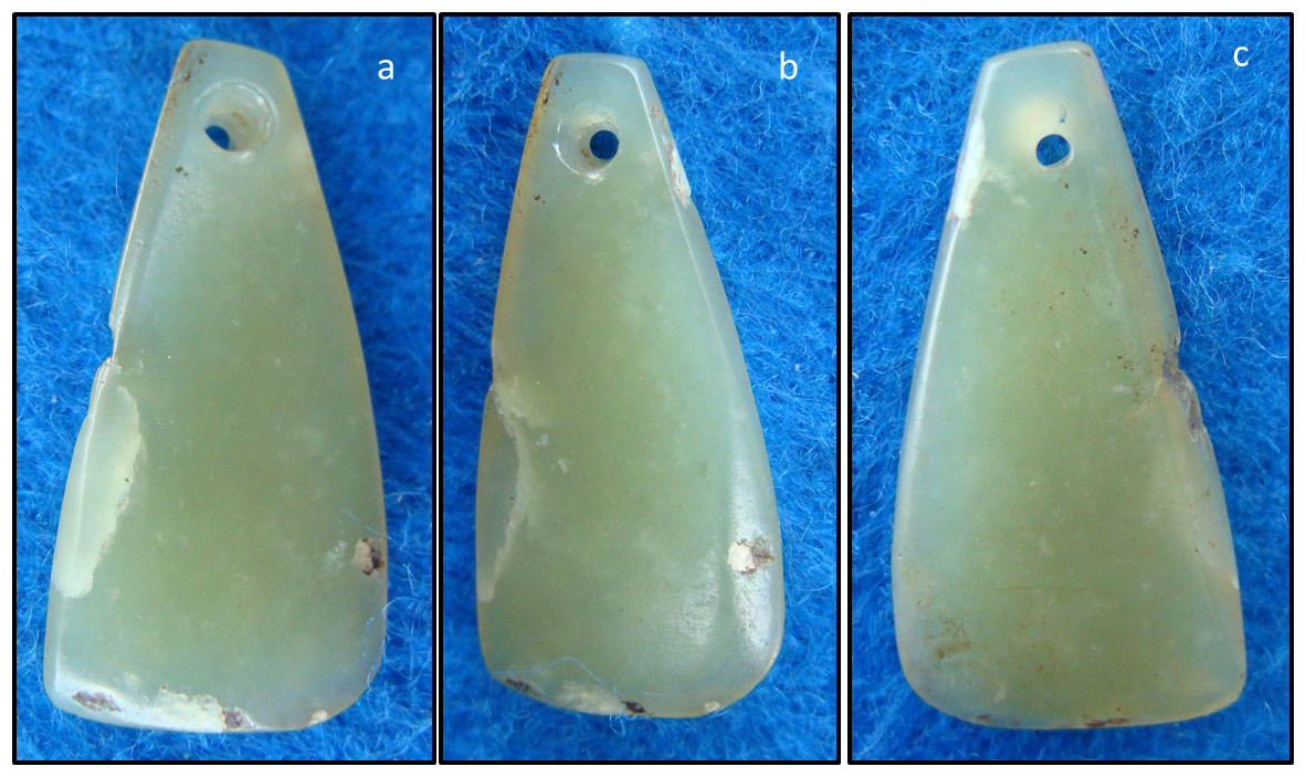 The pendant investigated here was probably initially conceived to be shaped as a muiraquitã suggested by the triangular shape and size, and mainly by the geological material, the nephritic jade or tremolite-type jade, much appreciated among the pendants, especially the muiraquitã; but its thickness, the fissures and microcavities certainly became a deterrent for manufacturing a muiraquitã. It is a piece of great historical value, as it was found in an archaeological funerary context a few inches below surface, and related to the Koriabo people, whom had contacts and exchange networks with the Karib-speaking people. Similar artifacts to MD 1 SA3 are known from the Caribbean region, produced in similar or non-similar materials in various shapes and forms, including frog-shaped, and by people whom were, at least partially, contemporaries of the Koriabo societies. It is very likely that muiraquitãs or similar pendants in Amazon had a strong connection with the Caribbean region, like Pearls.