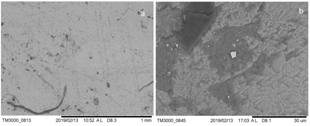 Figure 7 – SEM micrographs on the surface of the artifact: a) showing the stretch marks on the pendant polished surface; b) showing the typical acicular habits for tremolite (gray area) and the presence of clay mineral (dark gray area), mostly kaolinite, dirtiness, may Dark Earth soil (very dark area) and some opaque iron-chromium oxides (very small light gray area), possibly chromite.