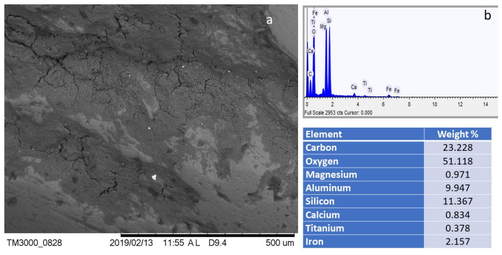 Figure 9 – a) SEM image of the pendant surface. The dark gray area represents dark earth soil stains and the white points Fe, Ti oxides; b) EDX/SEM chemical analysis (spectrum and table) for dark gray area illustrating the domain of Al, Si and O, that is, kaolinite, and possible organic carbon (soil material and dirtiness on the surface of the tremolite-bearing pendant, which is indicated by Ca, Mg, besides Si, O and Fe oxyhydroxides and anatase represented by Ti and O partially).
