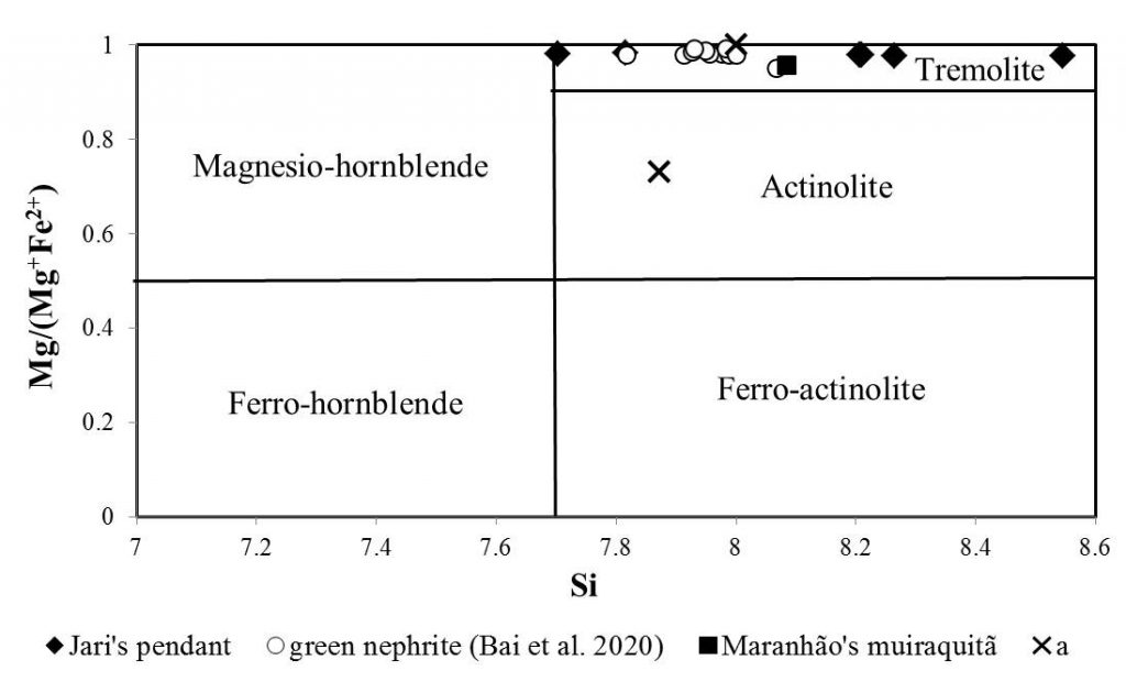 Figure 10 – Plotting of apfu for Jari pendant (this study), Maranhão´s muiraquitã (after chemical analyzes from Navarro et al., 2017) and the gemological nephrite from Dahua, Guangxi, Southern China (Bai et al., 2020).