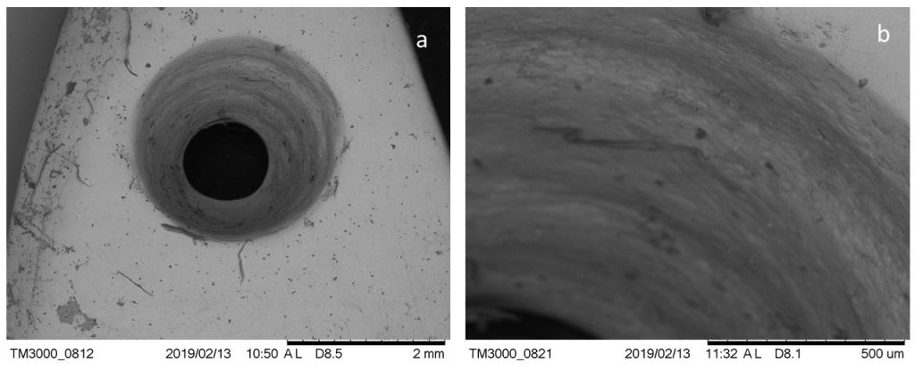 Figure 6 – SEM micrographs: a) conic small perforation; b) detail on the wall surface of the perforation showing four distinct levels formed by using three distinct cylindric artifacts, probably stone drills.