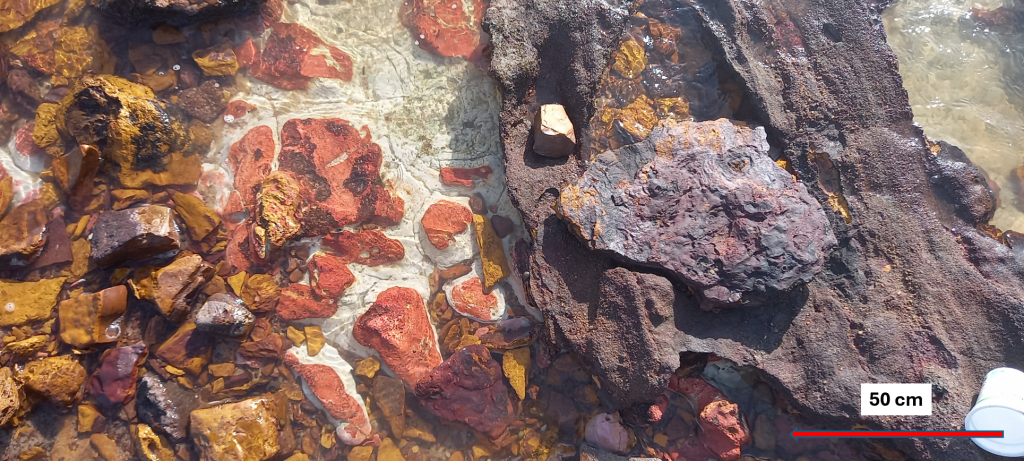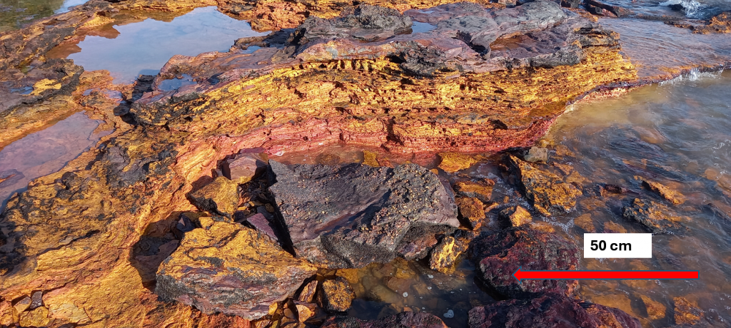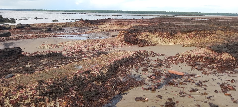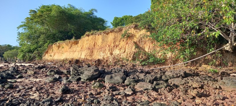 Na base do perfil laterítico, truncado erosivamente, exposto na praia, é possível observar uma ampla paletas de cores, destacando-se vermelho, lilás, ocre e marrom, com aspecto argiloso e forte untuosidade. O marrom escuro representa material duro, solidificado, formado por goethita férrica, denominado de pedra de ferro. Seus fragmentos são recobertos por “biofilmes” de goethita férrica, quando lambidos pelas ondas. Vide o artigo no link: https://gmga.com.br/a-utilizacao-ancestral-do-ocre-na-arte-rupestre-o-caso-das-lapas-do-parque-nacional-de-sete-cidades-pi/. Costa, M.L., Horbe, A.M.C., 1995. Pedras de ferro de interface areia-argila no perfil laterıítico da Ilha de Mosqueiro (região Norte, Brasil). Cad. Geociências 14, 61–68.