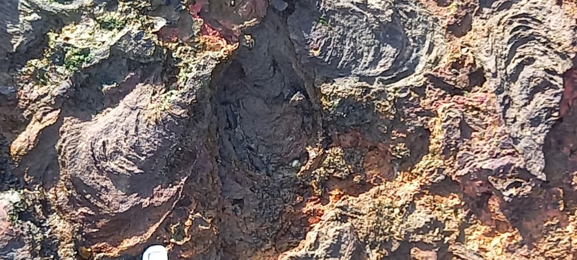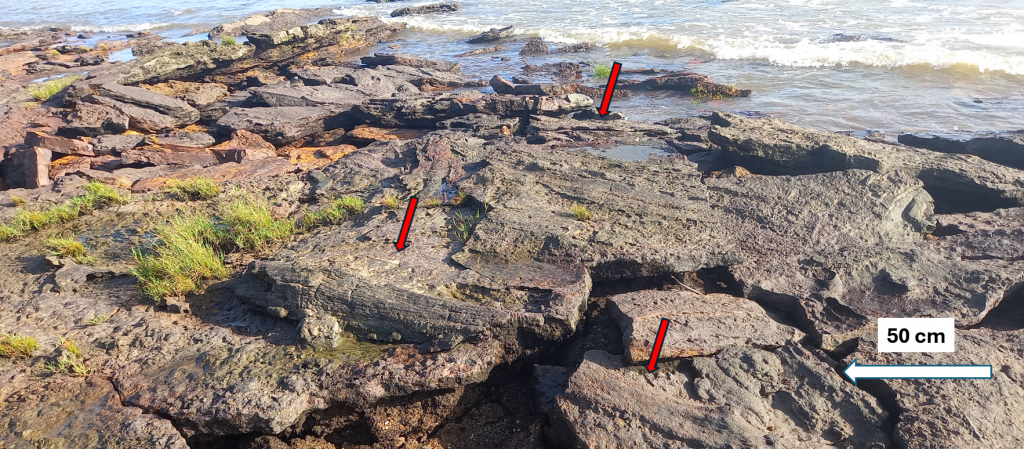 Já na manhã de 07.07.2024, pedalei, sozinho, ao longo da praia Grande da Baía do Sol. A imagem mostra essa praia em boa parte de sua extensão, ainda livre dos banhistas e seus traços costumazes. A maré já começara a subir e isto iria dificultar em parte as minhas atividades. Somente ao fundo, além da extensão visível, expõe-se o perfil laterítico em sua pujança. Para lá eu teria que pedalar, solo. O local estava deserto e normalmente não é recomendado para se andar sozinho. Perigo! Eu estava realmente com medo, mas me arrisquei. Tudo transcorreu sem sobressaltos, exceto a rápida subida da maré, dificultando o retorno. Não pude pedalar e sim, carregar a bike. Nesta porção da praia é possível observar troncos vegetais fósseis e traços fósseis de animais (icnofósseis), como Rhizocorallium.