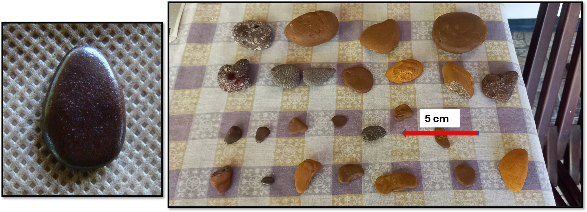 Mas algo que chama a atenção desde a muitos anos ao longo da caminhada, são as diferentes formas e constituições dos seixos que se espalham pela praia, como ilustrados nas duas imagens a seguir. Sobre esses seixos, eu e Edna Trindade, os coletamos desde muitos anos, em que Ela é a principal coletora e admiradora, e descobre as mais belas. Já os imortalizamos em jóias, texto e quadro. Algumas formas foram relacionadas a muiraquitãs (como sugerem algumas delas na imagem seguinte), e inclusive confeccionados como pingentes encastoados em prata. O mineral dominante e responsável pelas cores marrons é a goethita, tanto férrica quando férrico-aluminosa; pela cor vermelha, a hematita. O quartzo, além de caulinita, estão sempre presentes, porém não conferem pigmentação.