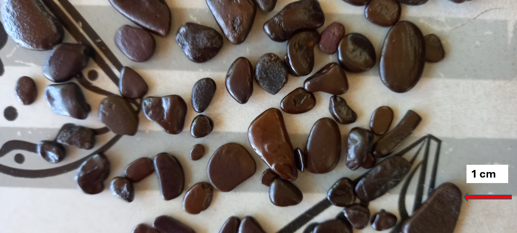 Na imagem a seguir se destacam seixos placosos, arredondados, marrons escuros, com contornos diversos, polidos naturalmente, constituídos por goethita férrica, que cimenta grãos de quartzo em tamanho silte .