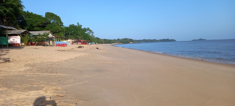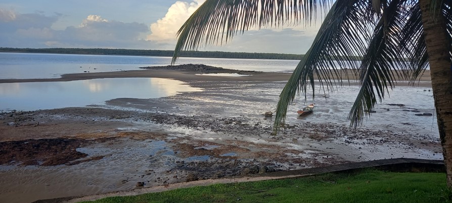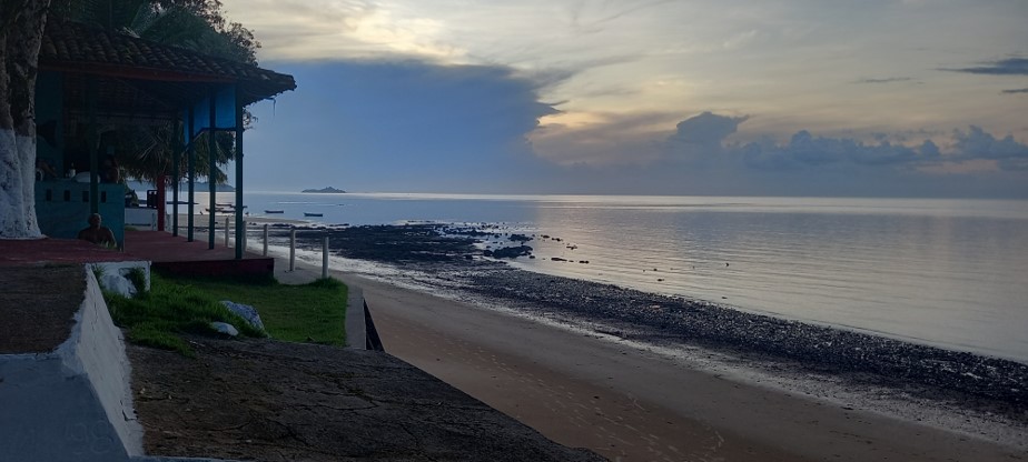 Ao final da tarde de 06.07.2024, sob baixa-mar, quando é possível observar as exposições dos materiais lateríticos ao longo do perfil completo, comecei pedalar pela orla da vila Baía do Sol. A imagem a seguir ilustra as condições de águas tranquilas, de sol se pondo, a areia da praia (franja clara) cobrindo parcialmente materiais rolados e também o material in situ da base do perfil laterítico, truncado erosivamente (franja escura). Aqui perambulo desde 1985, são quase 40 anos.