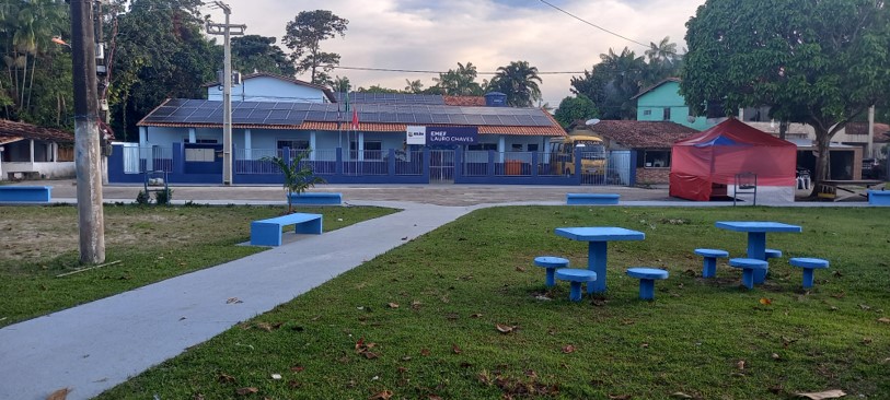 A praça do coreto, em frente à Escola Municipal Lauro Chaves, recém repaginada.